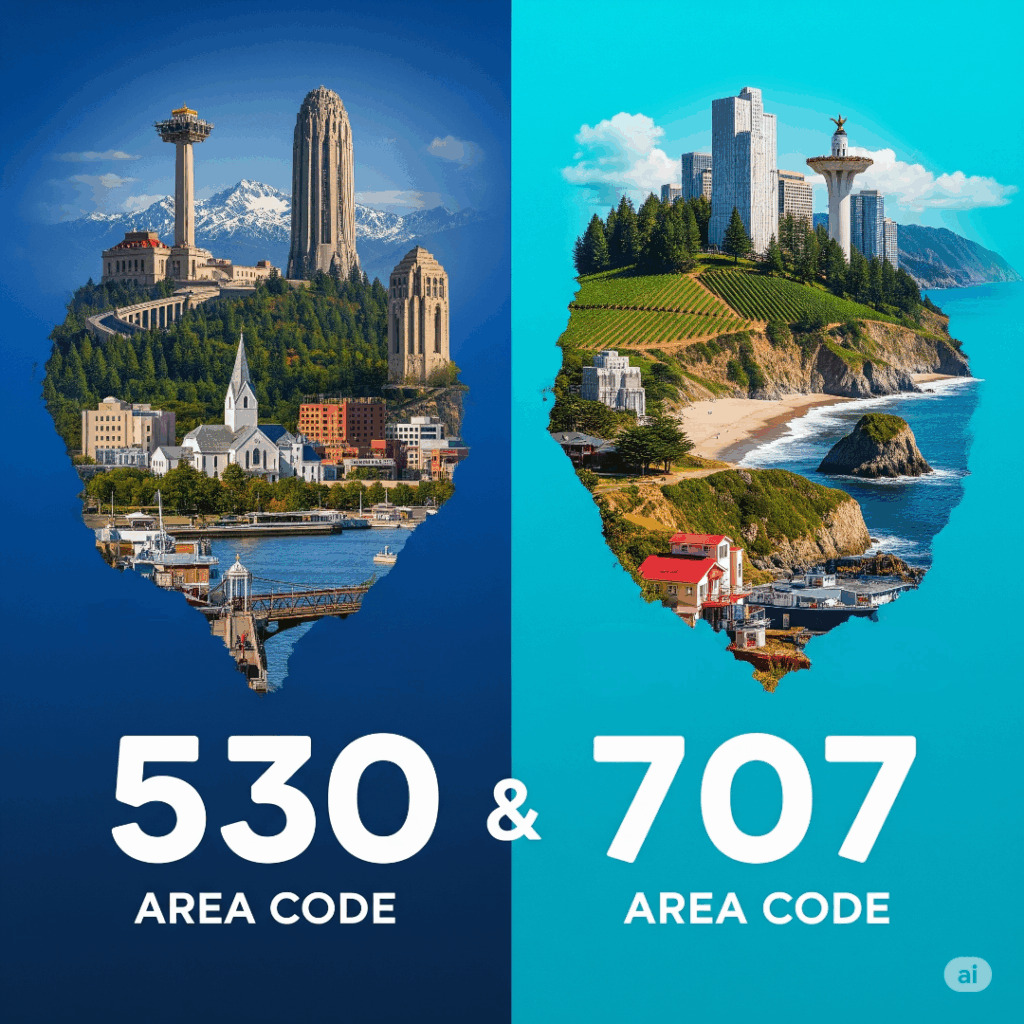 Dialing 10 numbers for a phone call. To increase the pool of available phone numbers on February 2023 the 369 area code was included with the 707 area, so both numbers reach the same area. For the same reason on January 2025 the 837 area code was included with the 530 area.